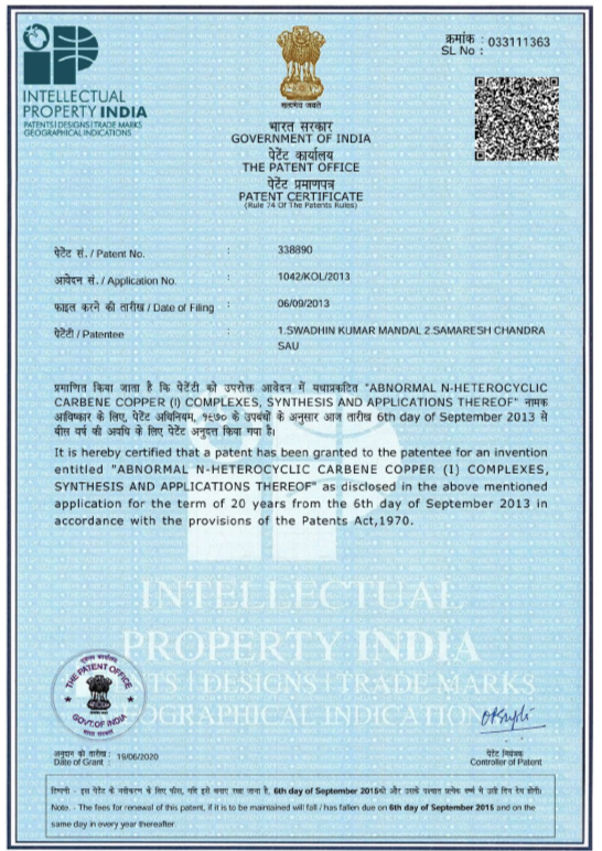 Swadhin K. Mandal, Samaresh Chandra Sau, “Abnormal N-Heterocyclic Carbene Copper(I) Complexes, Synthesis and Applications Thereof” (June 2020)