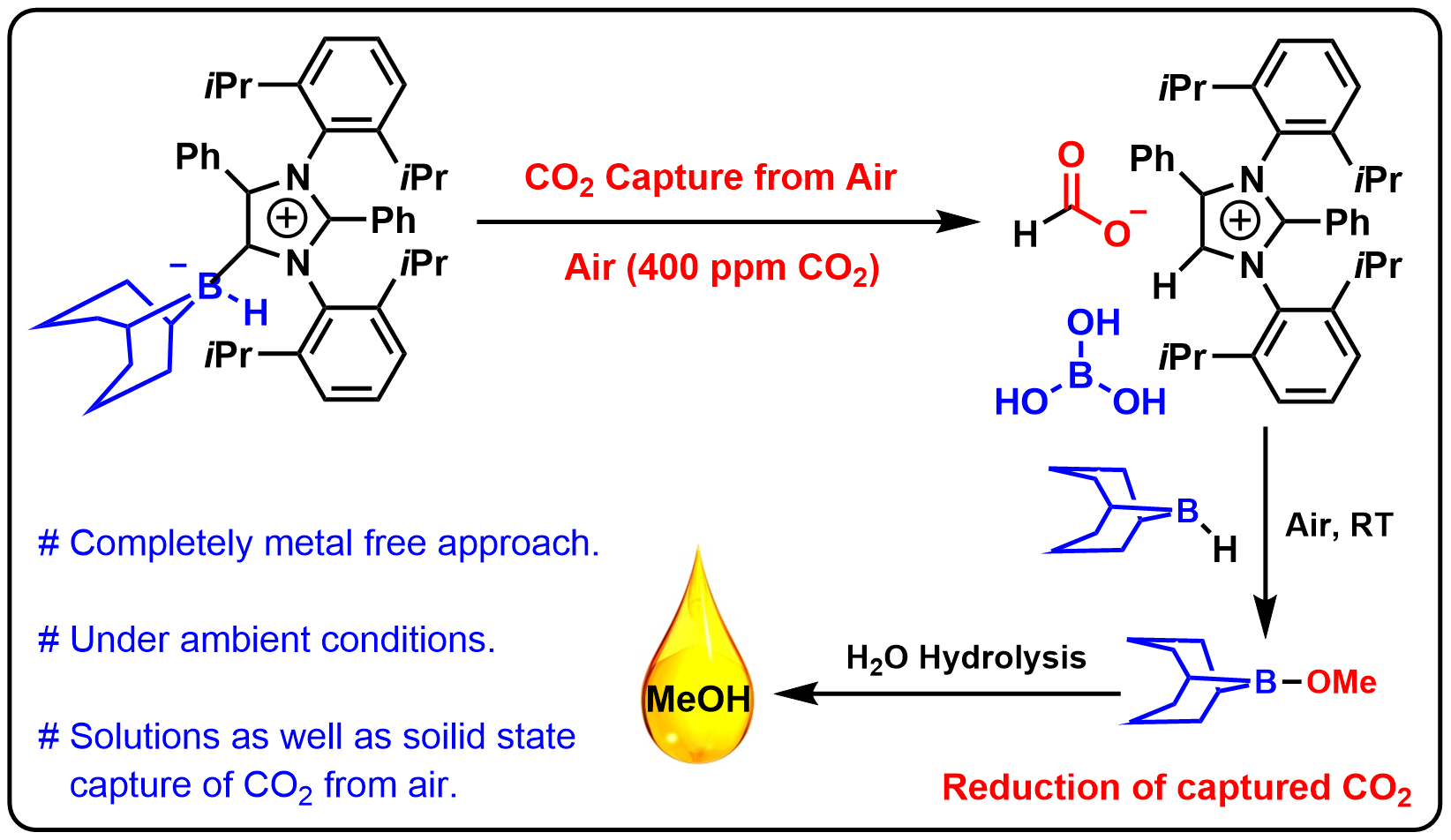 This work demonstrates the first-ever completely metal-free approach to the capture of CO2 from air followed by reduction to methoxyborane (which produces methanol on hydrolysis) or sodium formate (which produces formic acid on hydrolysis) under ambient conditions. This was accomplished using an abnormal N-heterocyclic carbene (aNHC)–borane adduct. The intermediate involved in CO2 capture (aNHC-H, HCOO, B(OH)3) was structurally characterized by single-crystal X-ray diffraction. Interestingly, the captured CO2 can be released by heating the intermediate, or by passing this compound through an ion-exchange resin. The capture of CO2 from air can even proceed in the solid state via the formation of a bicarbonate complex (aNHC-H, HCO3, B(OH)3), which was also structurally characterized. A detailed mechanism for this process is proposed based on tandem density functional theory calculations and experiments.