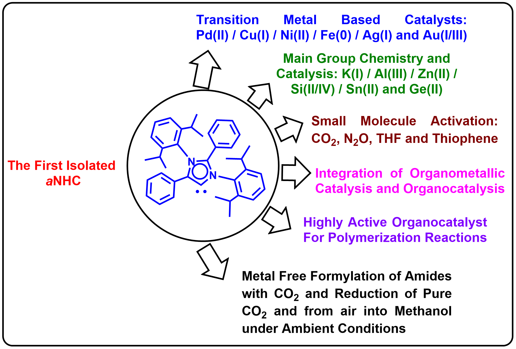 Although N-heterocyclic carbenes (NHCs) have been known as ligands for organometallic complexes since the 1960s, these carbenes did not attract considerable attention until Arduengo et al. reported the isolation of a metal-free imidazol-2-ylidene in 1991. In 2001 Crabtree et al. reported a few complexes featuring an NHC isomer, namely an imidazol-5-ylidene, also termed abnormal NHC (aNHCs). In 2009, it was shown that providing to protect the C-2 position of an imidazolium salt, the deprotonation occurred at the C-5 position, affording imidazol-5-ylidenes that could be isolated. Over the last ten years, stable aNHCs have been used for designing a range of catalysts employing Pd(II), Cu(I), Ni(II), Fe(0), Zn(II), Ag(I), and Au(I/III) metal based precursors. These catalysts were utilized for different organic transformations such as the Suzuki–Miyaura cross-coupling reaction, C–H bond activation, dehydrogenative coupling, Huisgen 1,3-dipolar cycloaddition (click reaction), hydroheteroarylation, hydrosilylation reaction and migratory insertion of carbenes. Main-group metal complexes were also synthesized, including K(I), Al(III), Zn(II), Sn(II), Ge(II), and Si(II/IV). Among them, K(I), Al(III), and Zn(II) complexes were used for the polymerization of caprolactone and rac-lactide at room temperature. In addition, based on the superior nucleophilicity of aNHCs, relative to that of their nNHCs isomers, they were used for small molecules activation, such as carbon dioxide (CO2), nitrous oxide (N2O), tetrahydrofuran (THF), tetrahydrothiophene and 9-borabicyclo[3.3.1]nonane (9BBN). aNHCs have also been shown to be efficient metal-free catalysts for ring opening polymerization of different cyclic esters at room temperature; they are among the most active metal-free catalysts for ε-caprolactone polymerization. Recently, aNHCs successfully accomplished the metal-free catalytic formylation of amides using CO2 and the catalytic reduction of carbon dioxide, including atmospheric CO2, into methanol, under ambient conditions. Although other transition metal complexes featuring aNHCs as ligand have been prepared and used in catalysis, this review article summarize the results obtained with the isolated aNHCs.