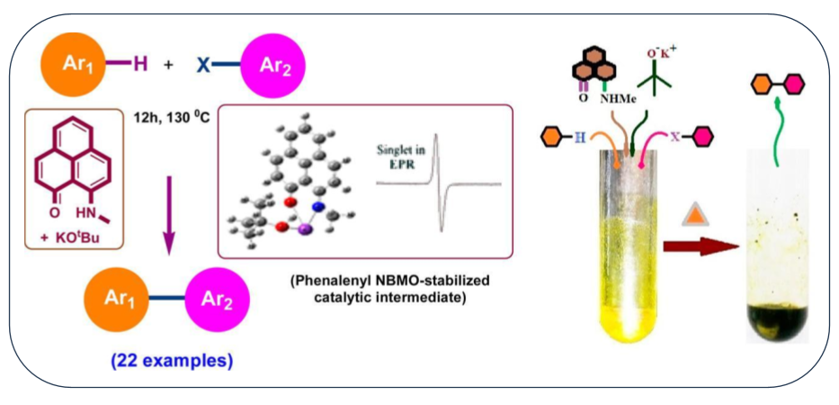 Open-shell phenalenyl chemistry has widely been explored in the last five decades demonstrating its potential in various applications including molecular switch, spin memory device, molecular battery, cathode material, etc. In this article, we have explored another new direction of open-shell phenalenyl chemistry toward transition metal-free catalytic C–H functionalization process. A phenalenyl ligand, namely, 9-methylamino-phenalen-1-one (4a), promoted chelation-assisted single electron transfer (SET) process, which facilitates the C–H functionalization of unactivated arenes to form the biaryl products. The present methodology offers a diverse substrate scope, which can be operated without employing any dry or inert conditions and under truly transition metal based catalyst like loading yet avoiding any expensive or toxic transition metal. This not only is the first report on the application of phenalenyl chemistry in C–H functionalization process but also provides a low-catalyst loading organocatalytic system (up to 0.5 mol % catalyst loading) as compared to the existing ones (mostly 20–40 mol %), which has taken advantage of long known phenalenyl based radical stability through the presence of its low-lying nonbonding molecular orbital.